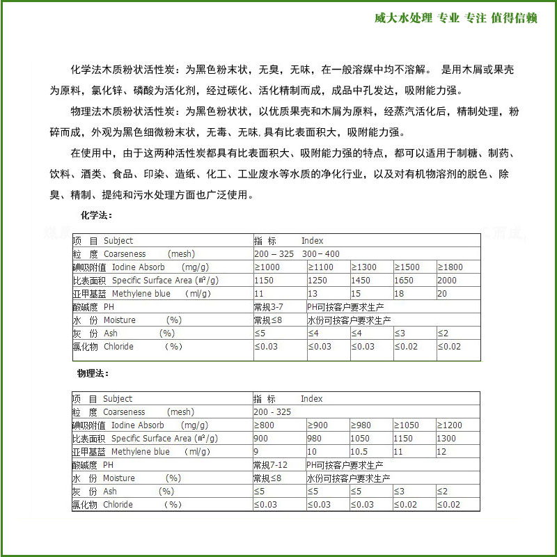 踏踏實實,弘揚匠人精神!兢兢業業,塑造民族品牌!感謝您關注威大水處理官網木質粉狀活性炭產品信息,也歡迎您提出寶貴的意見,共同推進中國制造的國際競爭力!對威大木質粉狀活性炭若有疑問的地方,請撥打威大技術工程師電話:【13838587319】,威大人愿與您攜手共同實現偉大中國夢!